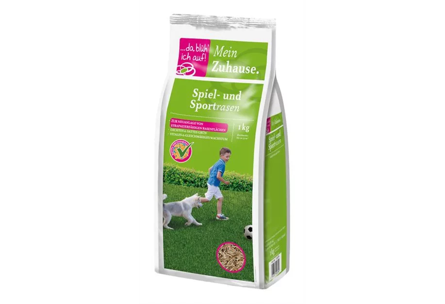 …da blüh‘ ich auf! Spiel- und Sportrasen ist bestens für Rasenflächen geeignet, die stark strapaziert werden. Dieser regenerationsfähige Rasen bevorzugt lichtreiche Standorte und wächst auf jedem Gartenboden. Er keimt schnell und gleichmäßig und ist bereits nach 6 – 8 Wochen belastbar. …da blüh‘ ich auf! Spiel- und Sportrasen ist pflegeleicht und widerstandsfähig gegen Rasenkrankheiten. Aufgrund seines dichten Wuchses verdrängt er Moos und Unkräuter.