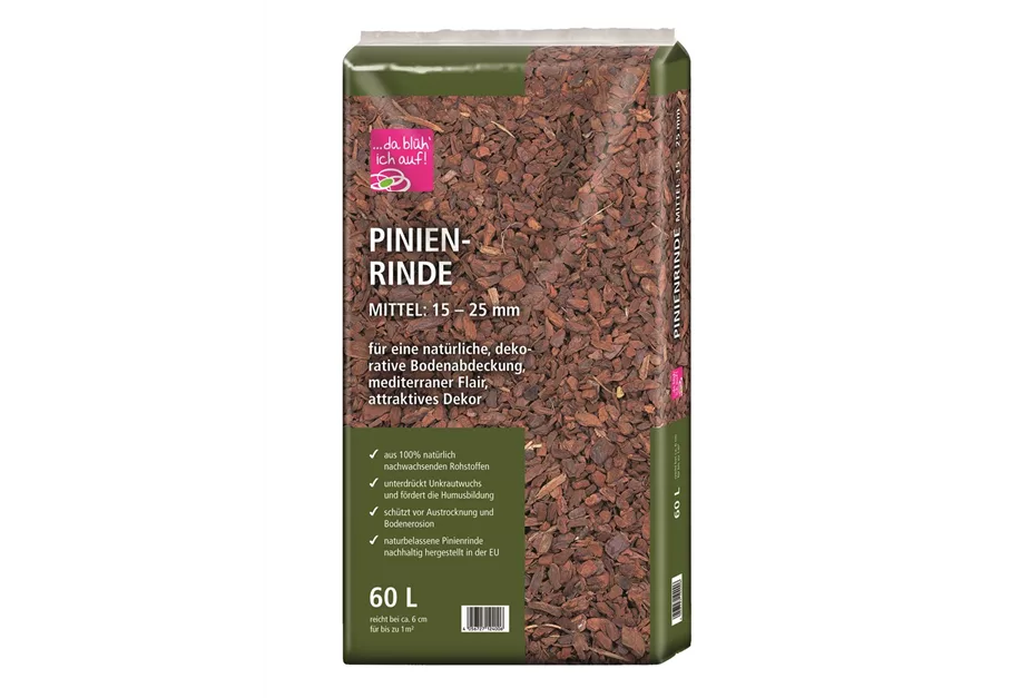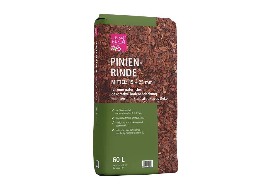 Unsere Pinienrinde ist eine natürliche, dekorative Bodenabdeckung für deine Beete und Wege.