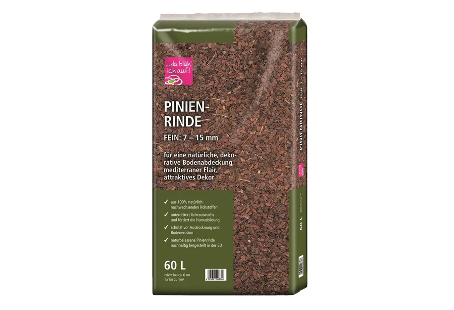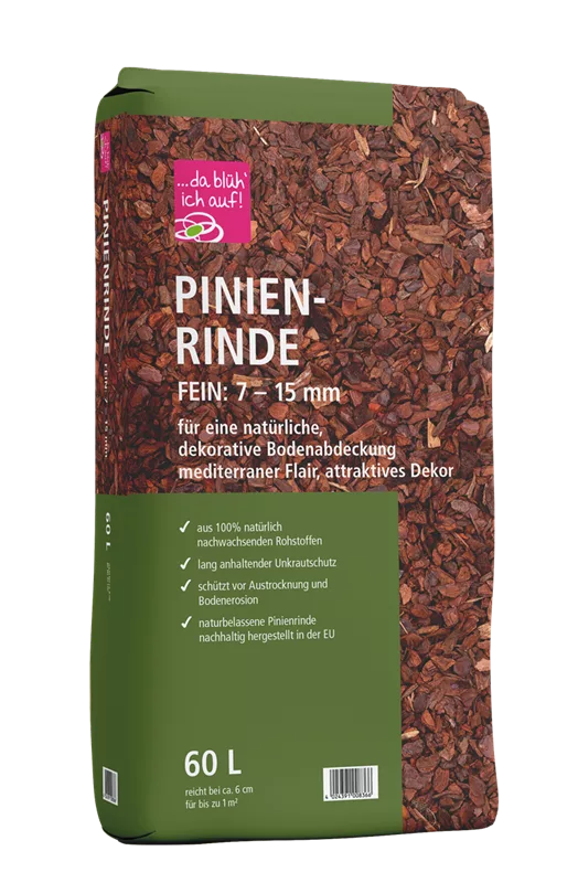 Unsere Pinienrinde ist eine natürliche, dekorative Bodenabdeckung für deine Beete und Wege.