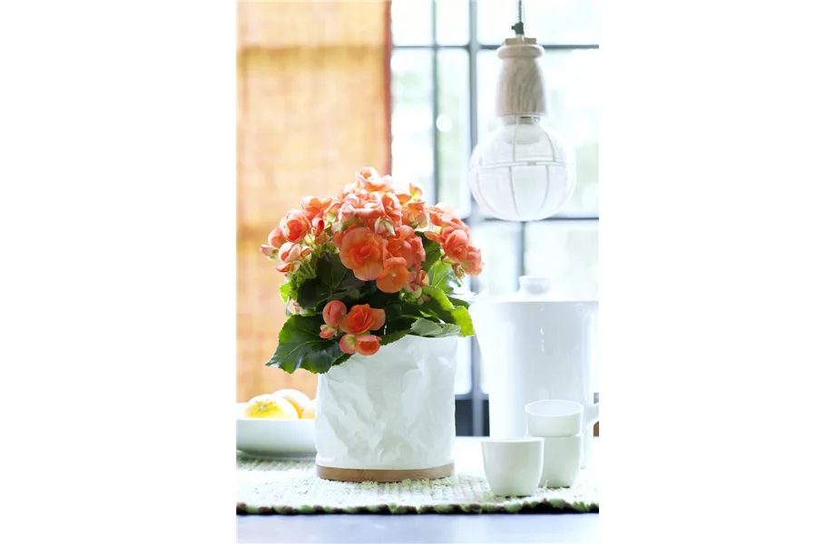 Die Begonie ist eigentlich sehr vielseitig. Natürlich macht sie eine gute Figur im herrlichen Vintage-Look in einem alten Tontopf, aber ihr Charakter verändert sich total in einem natürlichen Topf in klarem Design. In einem hellen modernen Topf wird die blühende Pflanze zu einem fröhlichen Farbtupfer im Interieur.